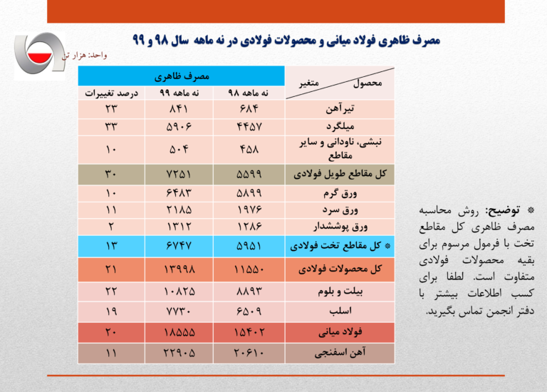 بر اساس گزارش آماری انجمن فولاد، مصرف ظاهری فولاد میانی (بیلت و بلوم و اسلب) با ۲۰ درصد رشد به ۱۸ میلیون و ۵۵۵ هزار تن رسید و مصرف ظاهری کل محصولات فولادی با ۲۱ درصد رشد نسبت به مدت مشابه سال قبل به ۱۳ میلیون و ۹۹۸ هزار تن رسید.