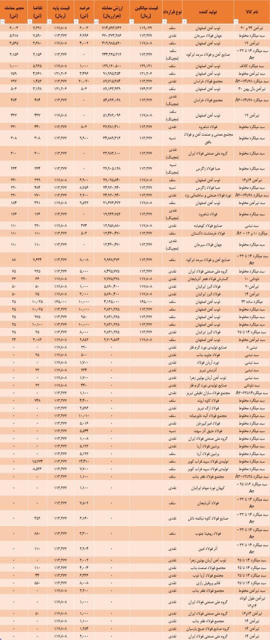 در جدول زیر نتایج معاملات امروز مقاطع طویل فولادی در بورس کالا را ببینید. اطلاعات معامله نظیر قیمت میانگین، قیمت پایه، میزان تقاضا و … در این جدول قابل مشاهده است.