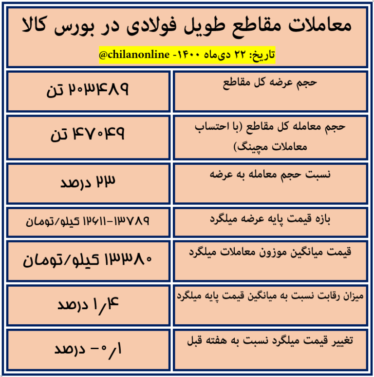 به گزارش چیلان ، امروز چهارشنبه ۲۲ دیماه، بورس کالا میزبان عرضه ۲۰۳ هزار و ۴۸۹ تن انواع مقاطع طویل فولادی بود که با احتساب معاملات مچینگ ۴۷ هزار و ۴۹ تن از این مقاطع معامله شد. نتیجه کامل معاملات امروز مقاطع طویل را در جدول زیر ببینید.