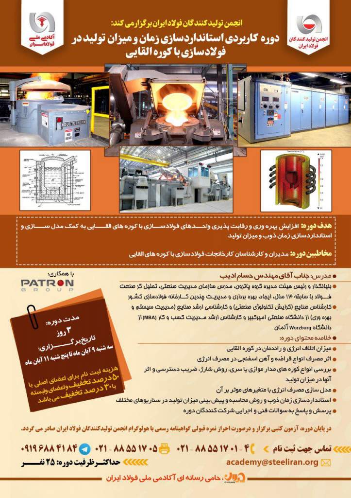 به گزارش چیلان ، محمد رضا دانشگر با اشاره به دوره های آموزشی برگزار شده این آکادمی در بخش های احیاء مستقیم، نورد گرم و فولادسازی در کوره های قوس الکتریکی، دوره بعدی آکادمی ملی فولاد را مختص کارخانجات ذوب القایی و همچنین طرح های در دست احداث ذوب با این کوره ها اعلام کرد و به خبرنگار چیلان گفت: چهارمین دوره آموزشی آکادمی ملی فولاد ایران تحت عنوان” دوره کاربردی استانداردسازی زمان و میزان تولید در فولادسازی با کوره القایی” با همکاری گروه پاترون و تدریس آقای مهندس ادیب در روزهای سه شنبه ۹ آبان تا پنج شنبه ۱۱ آبان ماه در انجمن تولیدکنندگان فولاد ایران برگزار می شود.
