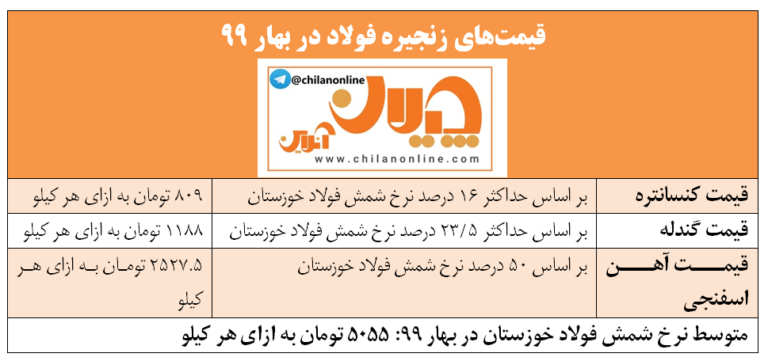 بر اساس میانگین قیمت شمش فولاد خوزستان در بهار ۹۹، میتوان به آخرین قیمتهای زنجیره فولاد که مربوطه به سهماهه اول سال ۹۹ است، پی برد. میانگین قیمت شمش فولاد خوزستان در سهماهه آخر سال ۹۸، ۵۰۵۵ تومان به ازای هر کیلو بوده است. بر این اساس، قیمت کنسانتره در بهار ۹۹، حداکثر ۸۰۹ تومان به ازای هر کیلو، قیمت گندله حداکثر ۱۱۸۸ تومان به ازای هر کیلو و قیمت آهن اسفنجی 2527.۵ تومان به ازای هر کیلو است.