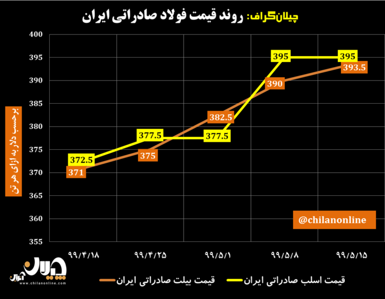 در نمودار زیر، قیمت اسلب و بیلت صادراتی ایران در یک ماه گذشته را ببینید: