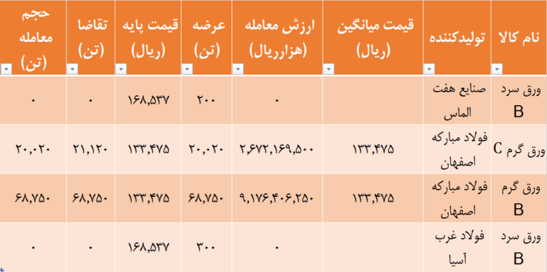 ارزش کل معاملات ورقهای فولادی در بورس کالا امروز ۱۱۸۵ میلیارد تومان بود. در جدول زیر نتایج معاملات امروز انواع ورق فولادی در بورس کالا را ببینید. اطلاعات معامله نظیر قیمت میانگین، قیمت پایه، میزان تقاضا و … در این جدول قابل مشاهده است.