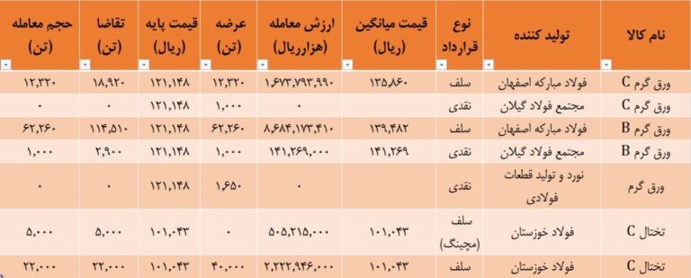 معاملات ورق گرم B فولاد مبارکه ۱۵ درصد بالاتر از قیمت پایه و معاملات ورق گرم C این شرکت ۱۰.۸ درصد بالاتر از قیمت پایه انجام شد. امروز اقبال خوبی برای خرید ورق گرم فولاد مبارکه در بورس کالا وجود داشت و تقاضا بر عرضه می‌چربید.