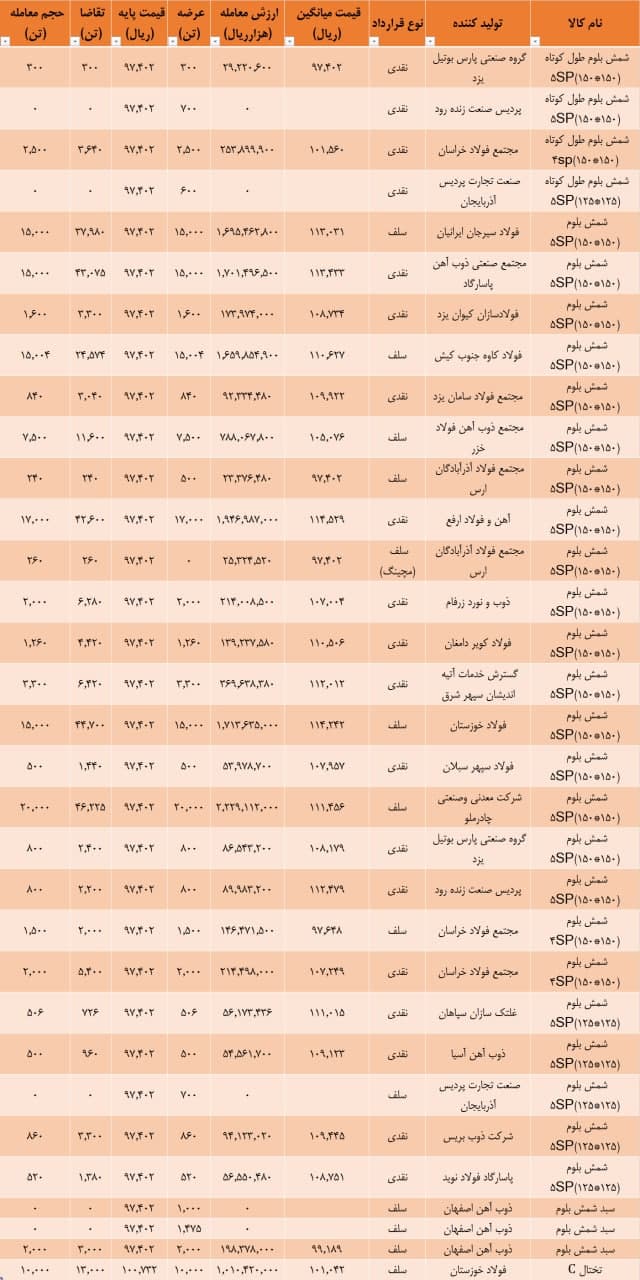 در جدول زیر 👇 نتایج معاملات امروز شمش بلوم و اسلب در بورس کالا را ببینید. اطلاعات معامله نظیر قیمت میانگین، قیمت پایه، میزان تقاضا و … در این جدول قابل مشاهده است.