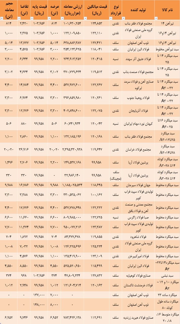 در جدول زیر نتایج معاملات امروز مقاطع طویل فولادی در بورس کالا را ببینید. اطلاعات معامله نظیر قیمت میانگین، قیمت پایه، میزان تقاضا و … در این جدول قابل مشاهده است.