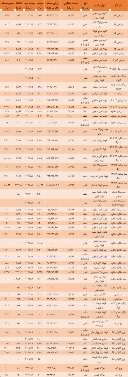 در جدول زیر نتایج معاملات امروز مقاطع طویل و ورق فولادی در بورس کالا را ببینید. اطلاعات معامله نظیر قیمت میانگین، قیمت پایه، میزان تقاضا و … در این جدول قابل مشاهده است.