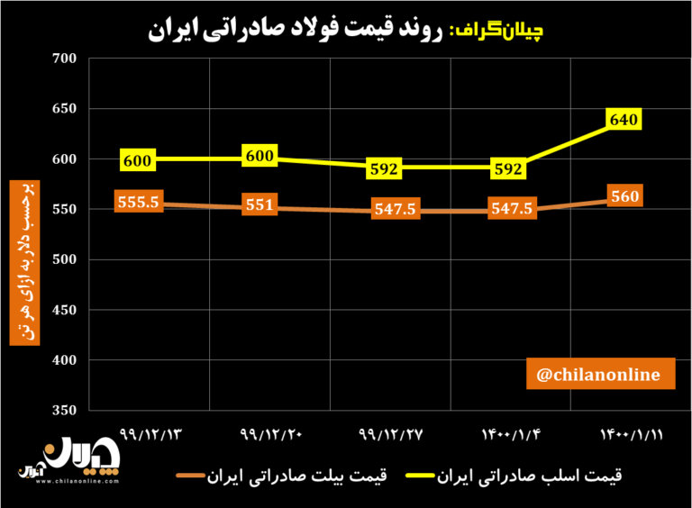 در نمودار زیر، قیمت اسلب و بیلت صادراتی ایران در یک ماه گذشته را ببینید: