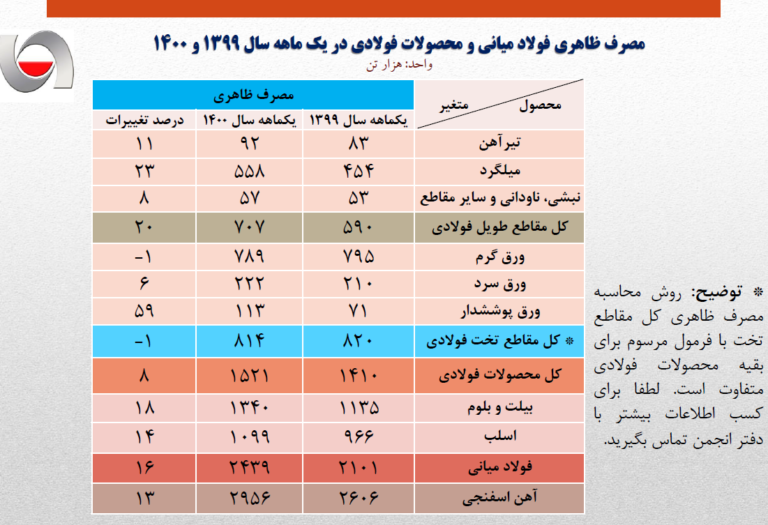 بر اساس گزارش آماری انجمن فولاد، مصرف ظاهری فولاد میانی (بیلت و بلوم و اسلب) با ۱۶ درصد رشد به ۲ میلیون و ۴۳۹ هزار تن رسید و مصرف ظاهری کل محصولات فولادی با ۸ درصد رشد نسبت به مدت مشابه سال قبل به ۱ میلیون و ۵۲۱ هزار تن رسید.