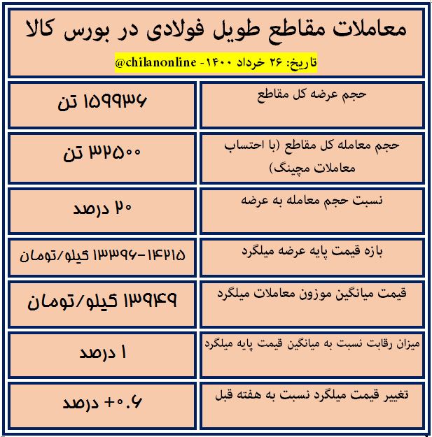 به گزارش چیلان ، امروز چهارشنبه ۲۶ خرداد، بورس کالا میزبان عرضه ۱۵۹ هزار و ۹۳۶ تن انواع مقاطع طویل فولادی بود که با احتساب معاملات مچینگ، ۳۲ هزار و ۵۰۰ تن مقاطع مورد معامله قرار گرفت. نتیجه کامل معاملات امروز مقاطع طویل را در جدول زیر ببینید.