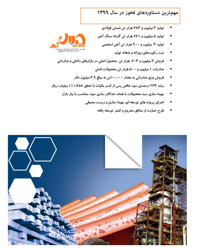 مهمترین دستاورهای فولاد خوزستان در سال ۱۳۹۹ به شرح زیر است: