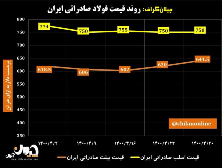 چیلان طبق روال هر هفته، آخرین قیمت‌های فولاد صادراتی ایران را بررسی می‌کند تا دیدی نسبت به درآمدهای ارزی صادرکنندگان فولاد کشور و فرصت‌های صادراتی پیش روی آنان به دست آید. در هفته گذشته، میانگین قیمت بیلت صادراتی ایران، ۶۴۱.۵ دلار به ازای هر تن بود که نسبت به هفته پیش از آن، افزایش قیمت قابل توجه ۲۱.۵ دلاری یا ۳.۵ درصدی را نشان می‌دهد. قیمت میانگین اسلب صادراتی ایران نیز در هفته گذشته ۷۵۰ دلار به ازای هر تن بود که تغییری را نشان نمی‌دهد.