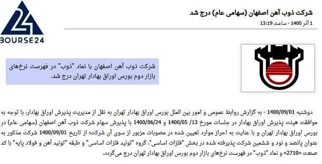 به گزارش چیلان ، شرکت ذوب آهن اصفهان اعلام نمود که دوشنبه ۱۴۰۰.۰۹.۱، به نقل از مدیریت پذیرش اوراق بهادار، با توجه به موافقت هیئت پذیرش اوراق بهادار با پذیرش سهام شرکت ذوب آهن اصفهان (سهامی عام) در بورس اوراق بهادار تهران و با عنایت به احراز موارد تعیین شده در مصوبات مزبور از سوی آن شرکت؛ از تاریخ ۱۴۰۰.۰۹.۰۱ شرکت مذکور به عنوان پانصد و نود و ششمین شرکت پذیرفته شده در ﺑﺨﺶ “فلزات اساسی”، گروه “تولید فلزات اساسی” و طبقه “تولید آهن و فولاد پایه” با کد صنعت «۲۷۱۰» و نماد “ذوب” در فهرست نرخهای بازار دوم بورس اوراق بهادار تهران درج میگردد.