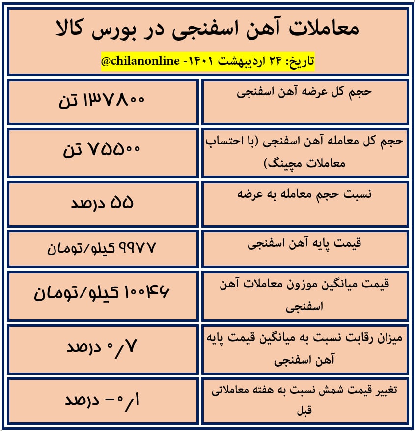 به گزارش چیلان ، امروز شنبه ۲۴ اردیبهشت ماه، بورس کالا میزبان عرضه ۱۳۷ هزار و ۸۰۰ تن آهن اسفنجی بود که از این عرضهها با احتساب معاملات مچینگ، ۷۵ هزار و ۵۰۰ تن مورد معامله قرار گرفت.