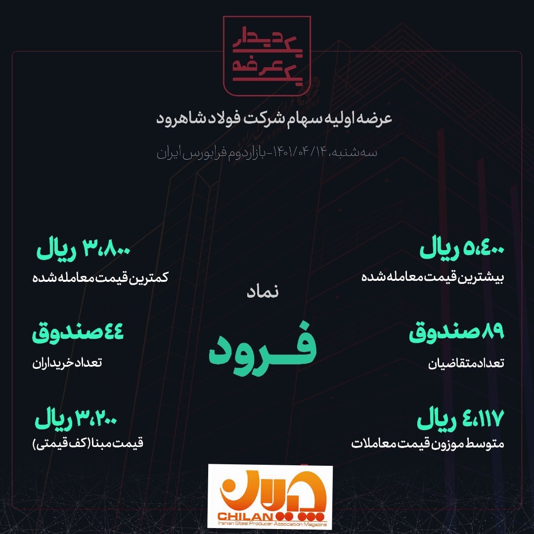 به گزارش  چیلان ، امروز سه‌شنبه ۱۴ تیر عرضه اولیه سهام شرکت فولاد شاهرود با نماد «#فرود» در فرابورس ایران انجام شد. سهام فولاد شاهرود امروز با ۴۱۱.۷ تومان به ازای هر سهم کشف قیمت شد و ۴۴ صندوق خریدار سهام این شرکت در روز عرضه اولیه آن بودند.
