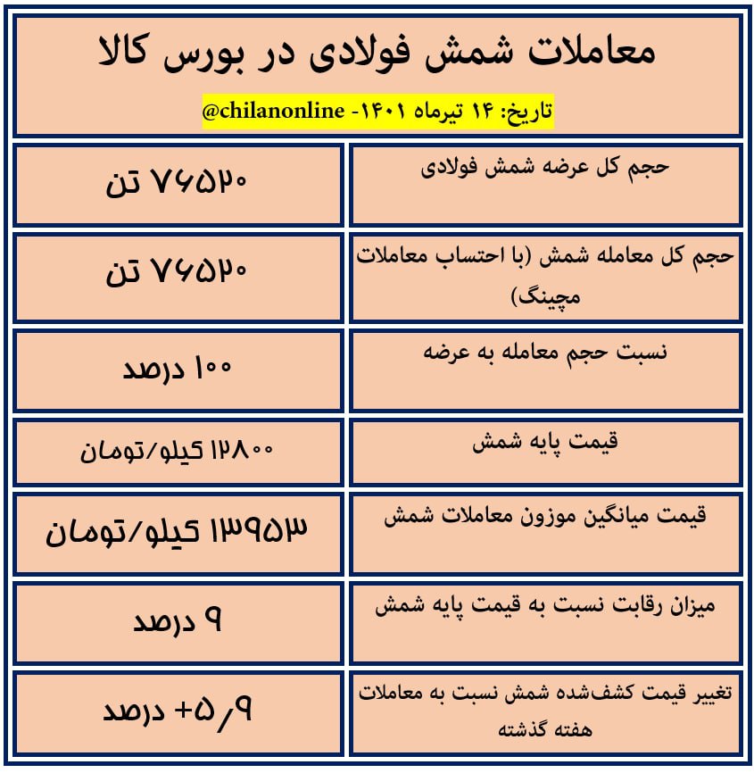 به گزارش چیلان ، امروز ۱۴ تیرماه، بورس کالا میزبان عرضه ۷۶ هزار و ۵۲۰ تن شمش بلوم بود که کل این عرضهها مورد معامله قرار گرفته است.
