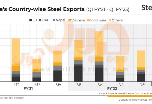 به گزارش چیلان ، صادرات فولاد هند در سهماهه نخست سال مالی ۲۳-۲۰۲۲ (آوریل تا ژوئن ۲۰۲۲) ۳۴ درصد نسبت به دوره مشابه سال قبل کاهش یافته و به ۳.۷۸ میلیون تن رسیده است.