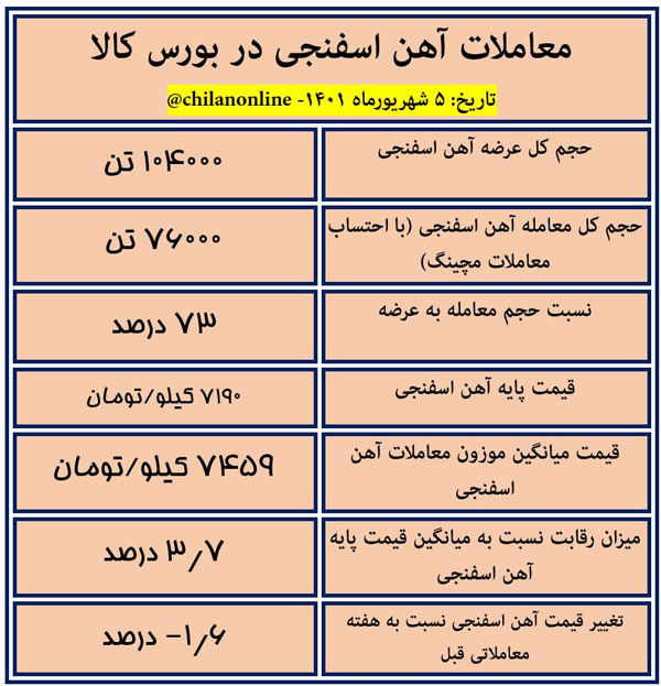 به گزارش چیلان ، امروز شنبه ۵ شهریورماه، بورس کالا میزبان عرضه ۱۰۴ هزار تن آهن اسفنجی بود که از این عرضهها با احتساب معاملات مچینگ، ۷۶ هزار تن مورد معامله قرار گرفت.