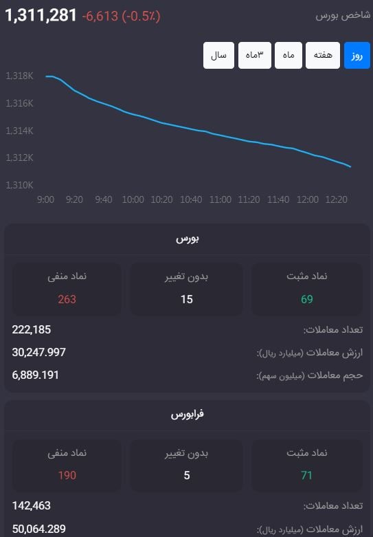 به گزارش چیلان ، امروز یکشنبه ۲۴ مهرماه شاخص کل بورس ۶۶۱۳ واحد کاهش یافت و به ۱ میلیون و ۳۱۱ هزار و ۲۸۱ واحد رسید. ۶۹ نماد بازار بورس امروز مثبت و ۲۶۳ نماد نماد منفی بودند.