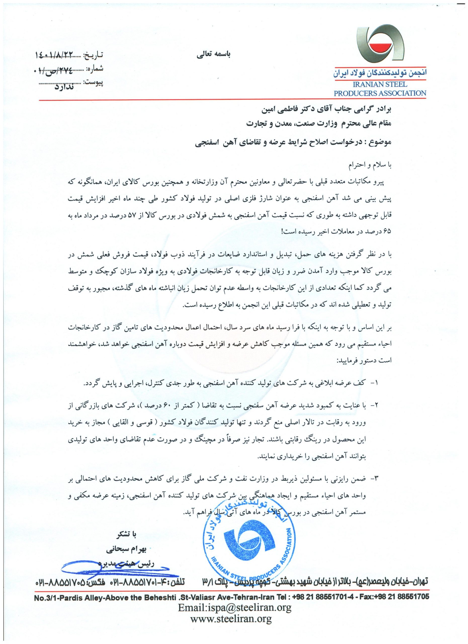موضوع : درخواست اصلاح شرایط عرضه و تقاضای آهن اسفنجی