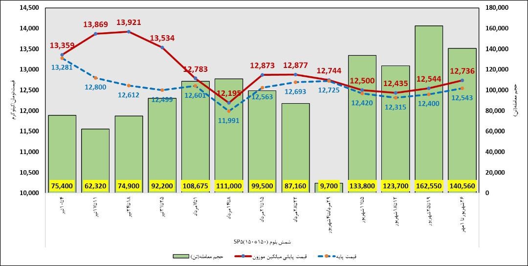 در نمودار زیر روند حجم و قیمت معاملات شمش در بورس کالا را ببینید: