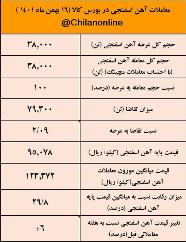 به گزارش  چیلان ، امروز ۱۶ بهمن ماه ۱۴۰۱، بورس کالا میزبان عرضه ۳۸۰۰۰ تن آهن اسفنجی بود که با توجه به عدم عرضه این محصول در هفته گذشته و ثبت تقاضای بیش از ۲ برابری، کل این عرضه ها مورد معامله قرار گرفت.