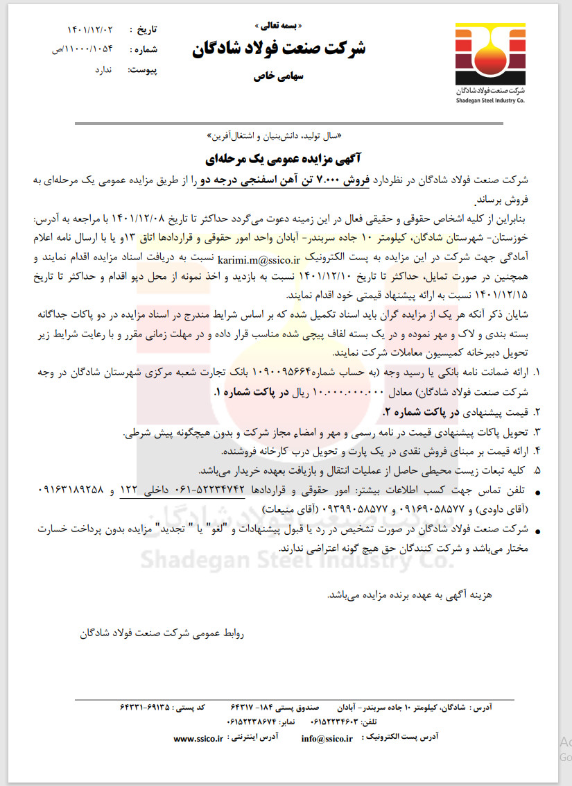 بنابراین از کلیه اشخاص حقوقی و حقیقی فعال در این زمینه دعوت میگردد حداکثر تا تاریخ ۱۴۰۱/۱۲/۰۸ با مراجعه به آدرس: خوزستان شهرستان شادگان کیلومتر ۱۰ جاده سربندر آبادان واحد امور حقوقی و قراردادها اتاق ۱۳ و یا با ارسال نامه اعلام آمادگی جهت شرکت در این مزایده به پست الکترونیک karimi.m@ssico.ir نسبت به دریافت اسناد مزایده اقدام نمایند و همچنین در صورت تمایل حداکثر تا تاریخ ۱۴۰۱/۱۲/۱۰ نسبت به بازدید و اخذ نمونه از محل دپو اقدام و حداکثر تا تاریخ ۱۴۰۱/۱۲/۱۵ نسبت به ارائه پیشنهاد قیمتی خود اقدام نمایند.