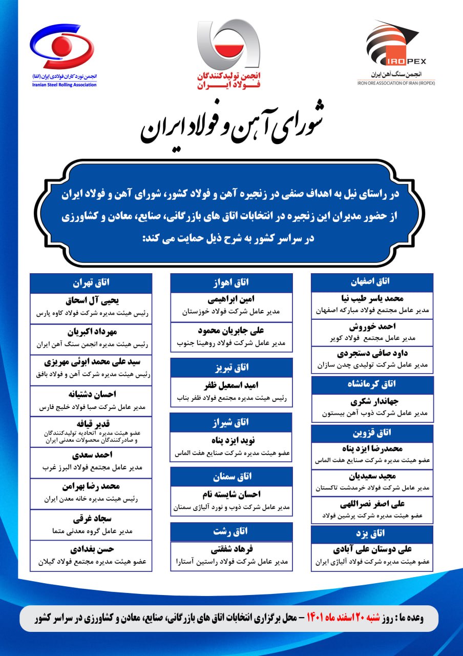 شورای آهن و فولاد ایران متشکل از انجمن تولیدکنندگان فولاد ایران، انجمن سنگ آهن ایران و انجمن نوردکاران فولادی ایران، لیست صنفی مورد حمایت خود در انتخابات اتاق های بازرگانی، صنایع، معادن و کشاورزی سراسر کشور را منتشر کرد.