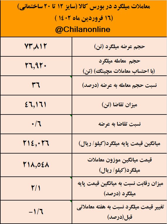 به گزارش چیلان ، امروز چهارشنبه ۱۶ فرودین ۱۴۰۲، ۷۳ هزارتن میلگرد پرمصرف ساختمانی (سایز ۱۲ تا ۲۰) در بورس کالا عرضه شد که با احتساب معاملات مچینگ، ۲۷ هزار تن حدود ۳۶ درصد از این عرضهها مورد معامله قرار گرفت!