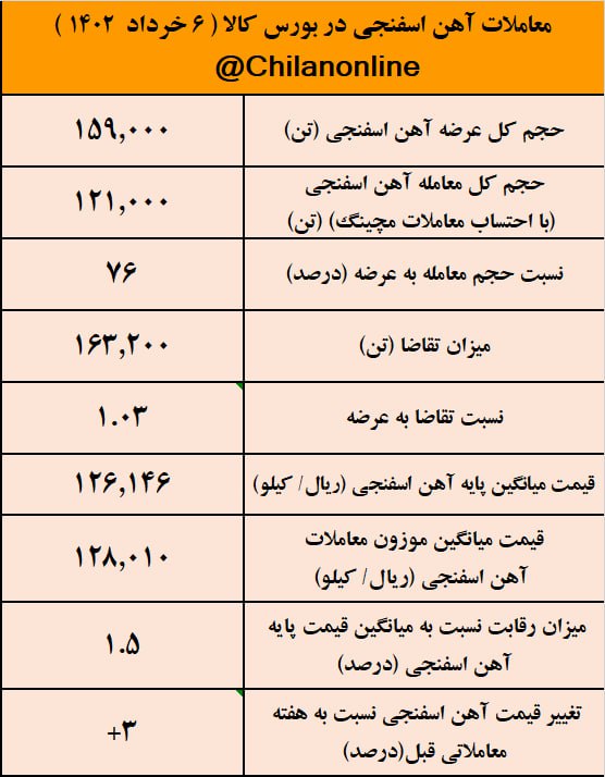 به گزارش چیلان ، امروز ۶ خرداد ۱۴۰۲، بورس کالا میزبان عرضه ۱۵۹ هزار تن آهن اسفنجی بود که تقریبا ۷۶ درصد عرضهها مورد معامله قرار گرفت.