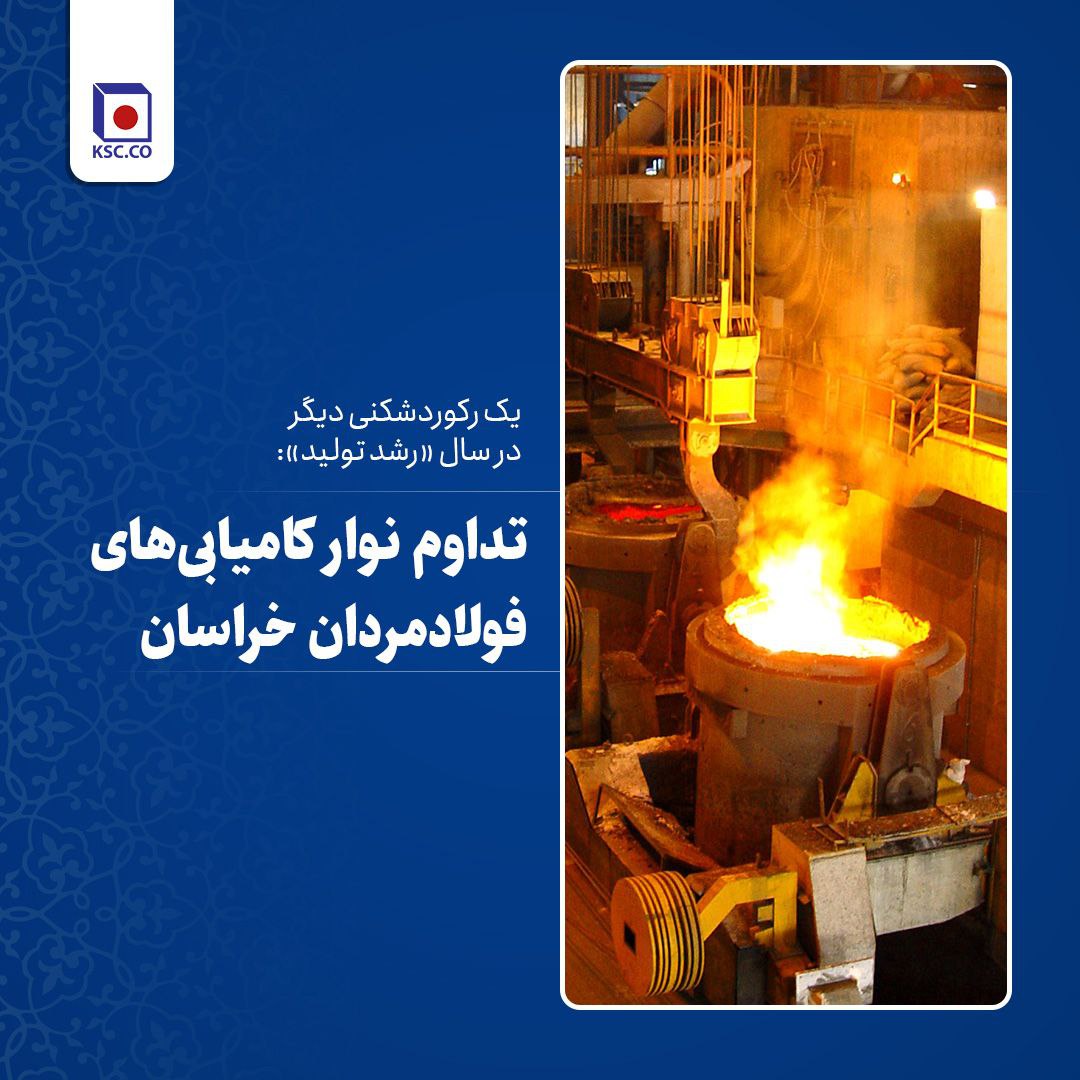 کارکنان فولاد خراسان که در خردادماه موفق به شکستن دو رکورد تولیدی (تولید روزانهی شمش و نیز رکورد تعداد ذوبهای متوالی در یک سکوئنس شده بودند)، در حالی پا به تیرماه میگذارند که نِصاب تولید ماهانه در فولادسازی شماره۲ این شرکت را نیز جابهجا کردهاند.