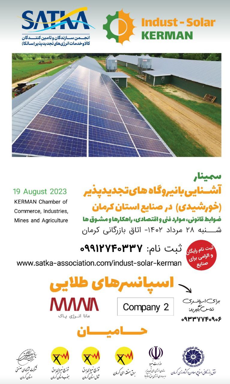 سمینار استفاده از نیروگاههای تجدیدپذیر برای تامین برق صنایع استان کرمان با حضور صنایع استان کرمان، شرکتهای تجدیدپذیر، ساتبا، شرکتهای توزیع برق شمال و جنوب کرمان و برق منطقه ای کرمان و شرکت شهرکهای صنعتی استان کرمان برگزار می شود.