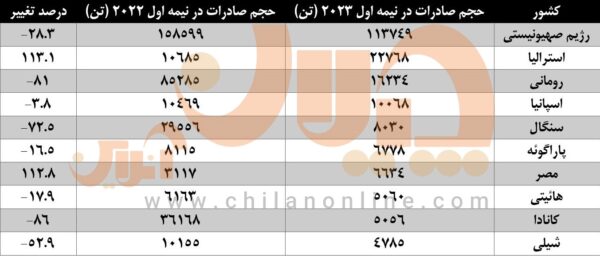 ارقام جدول گویای این است که حجم صادرات در شش ماهه سال جاری نسبت به شش ماهه سال گذشته به همه مقاصد به جز استرالیا و مصر کاهش داشته است.