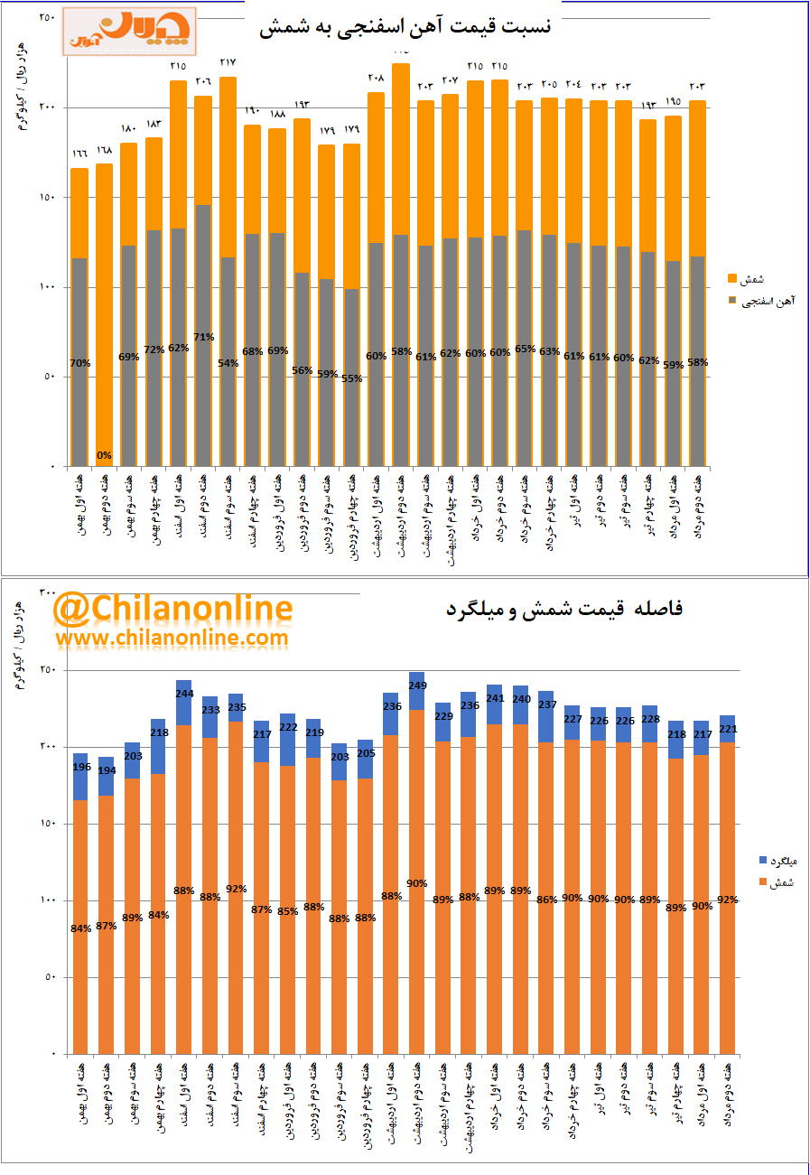 نسبت قیمت آهن اسفنجی به شمش فولادی که در هفته اول مرداد ماه به 59 درصد رسیده بود، در هفته جاری با کاهش 1 درصدی به ۵۸ درصد رسید. این شاخص از ابتدای سال جاری تاکنون بین 55 تا 69 درصد نوسان داشته است.