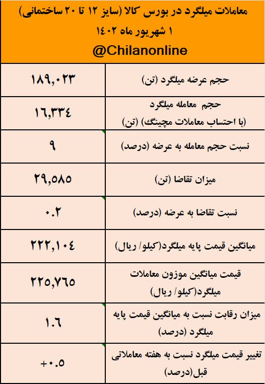 به گزارش چیلان ،امروز چهارشنبه ۱ شهریور ۱۴۰۲، ۱۸۹ هزارتن میلگرد پرمصرف ساختمانی (سایز ۱۲ تا ۲۰) در بورس کالا عرضه شد که با احتساب معاملات مچینگ، فقط ۱۶ هزارتن معادل ۹ درصد از این عرضهها مورد معامله قرار گرفت، که این میزان پایین ترین نسبت حجم معاملات به عرضه میلگرد در سال جاری است.