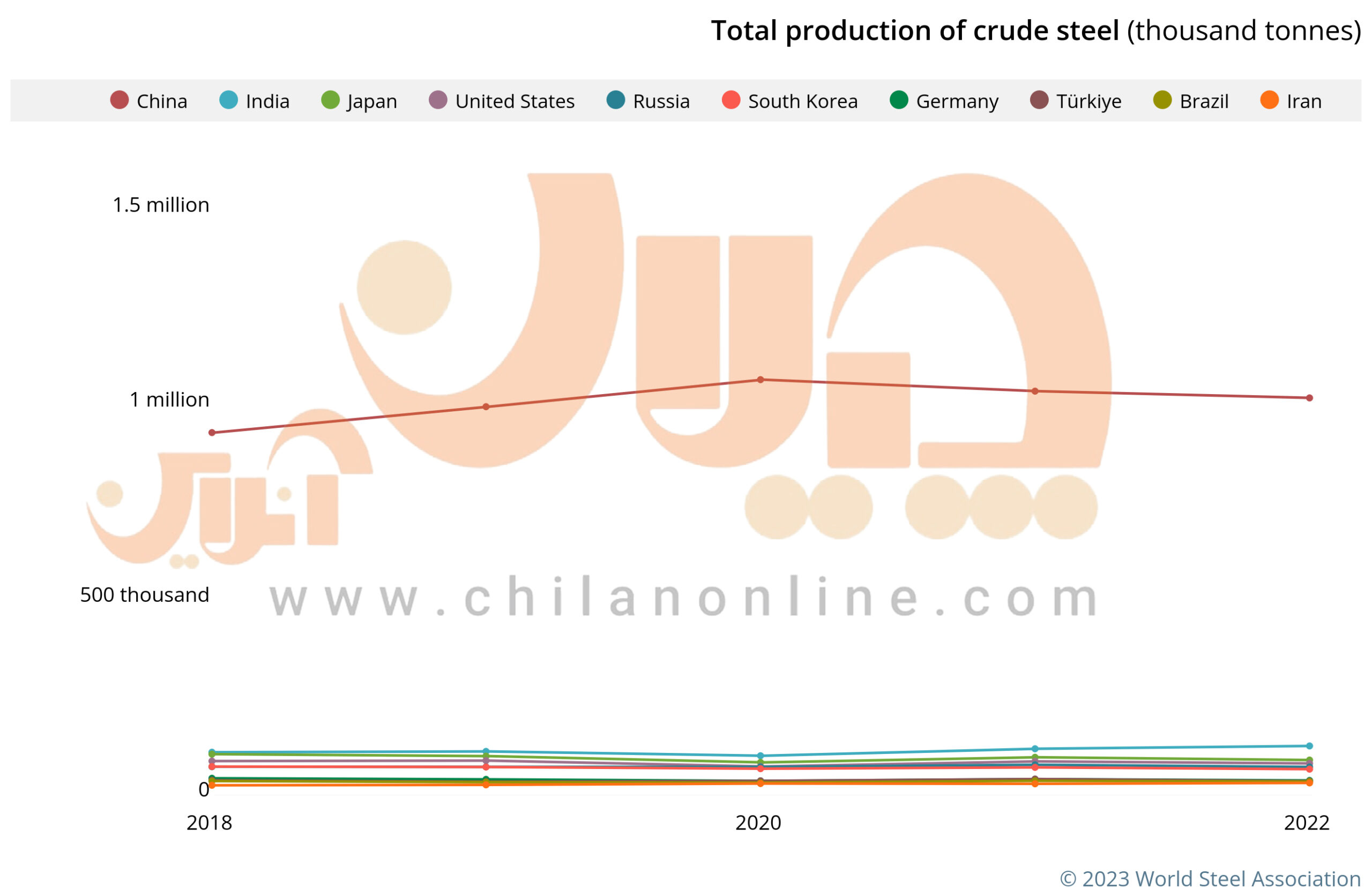 به گزارش چیلان نمودار زیر براساس دادههای انجمن جهانی فولاد ایران ترسیم شده است. نمودار تولید فولاد میانی در چین در جایگاه بزرگترین تولیدکننده فولاد جهان را در سالهای ۲۰۱۸ تا ۲۰۲۲ میلادی نشان میدهد (منحنی قرمز تیره)