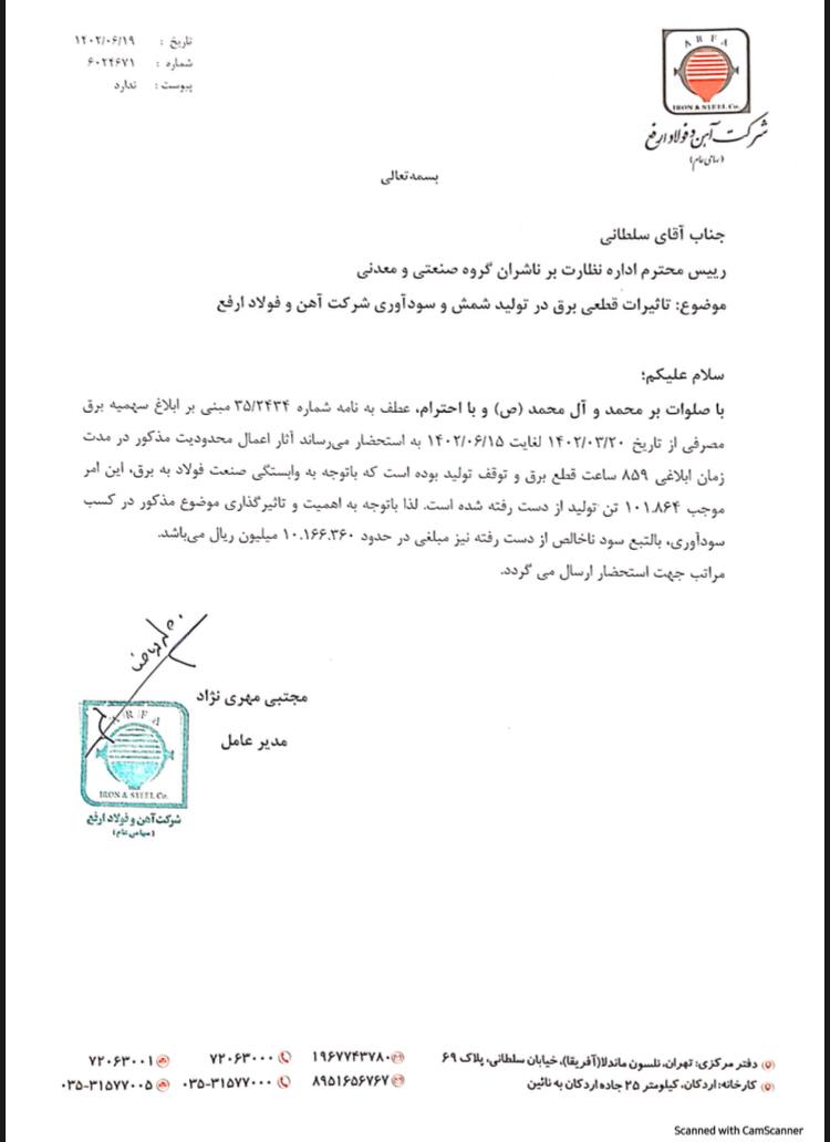 مجتبی مهرینژاد مدیرعامل شرکت آهن و فولاد ارفع طی نامهای به رئیس اداره نظارت بر ناشران گروه صنعتی و معدنی سازمان بورس اعلام کرد که محدودیتهای مصرف برق برای «ارفع» از تاریخ ۲۰ خرداد تا ۱۵ شهریور امسال جمعاً باعث ۸۵۹ ساعت قطعی برق این کارخانه و توقف تولید شده است که در نتیجه این محدودیتها، ۱۰۱ هزار و ۸۶۴ تن از تولید شمش فولادی ارفع از دست رفته است.