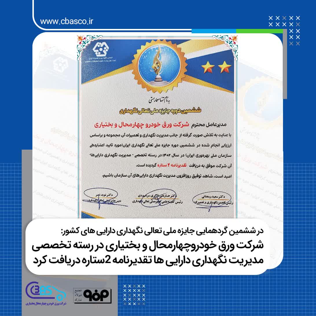 - شرکت ورق خودرو چهارمحال و بختیاری جایزه ۲ستاره تعالی نگهداری و مدیریت دارایی را دریافت کرد