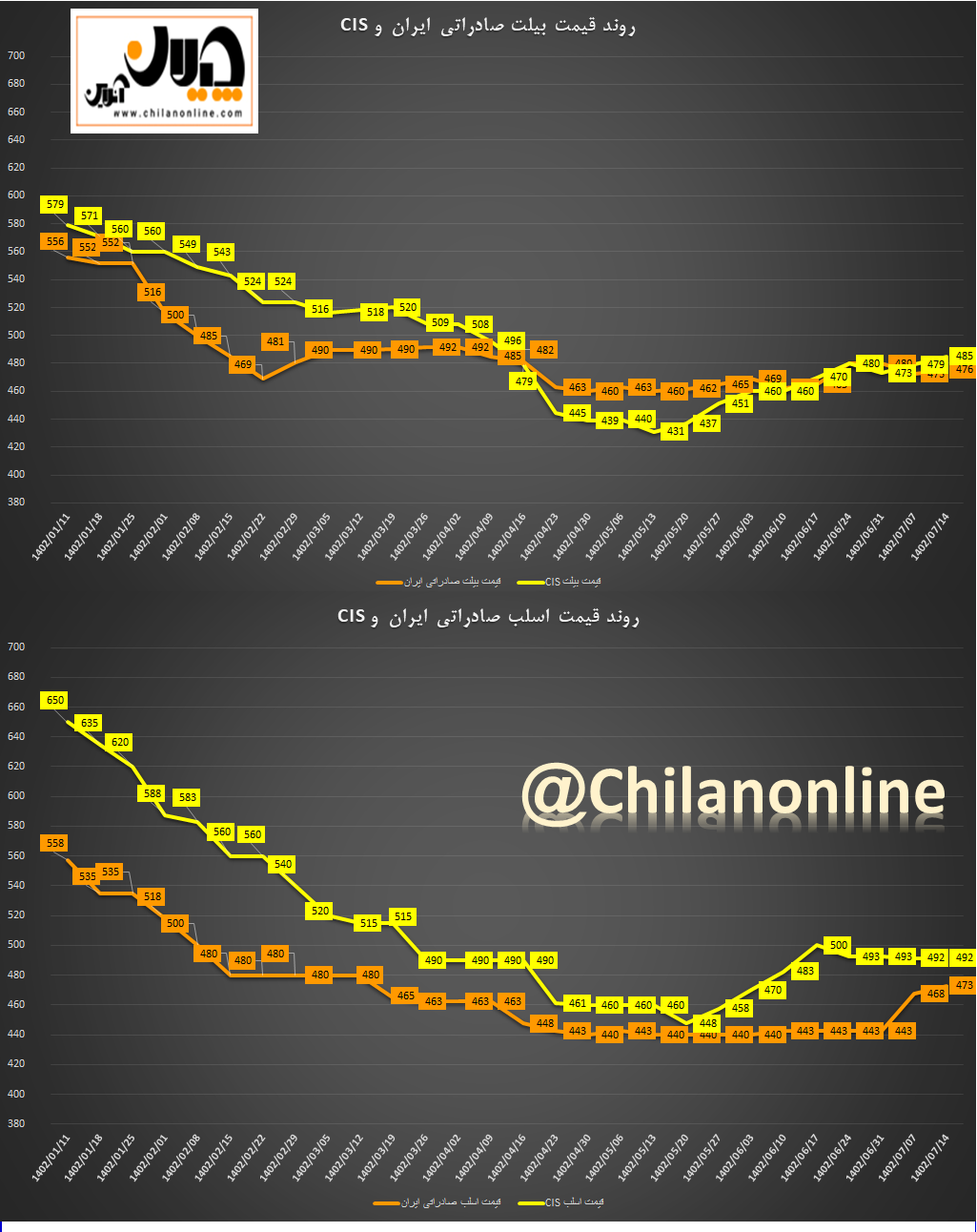 قیمت هر تن اسلب صادراتی CIS بدون تغییر نسبت به هفته گذشته در همان سطح ۴۹۲ دلار باقی ماند. از طرف دیگر اسلب صادراتی ایران با ۱.۲درصد رشد نسبت به هفته گذشته به ۴۷۳ دلار بر تن رسید.
