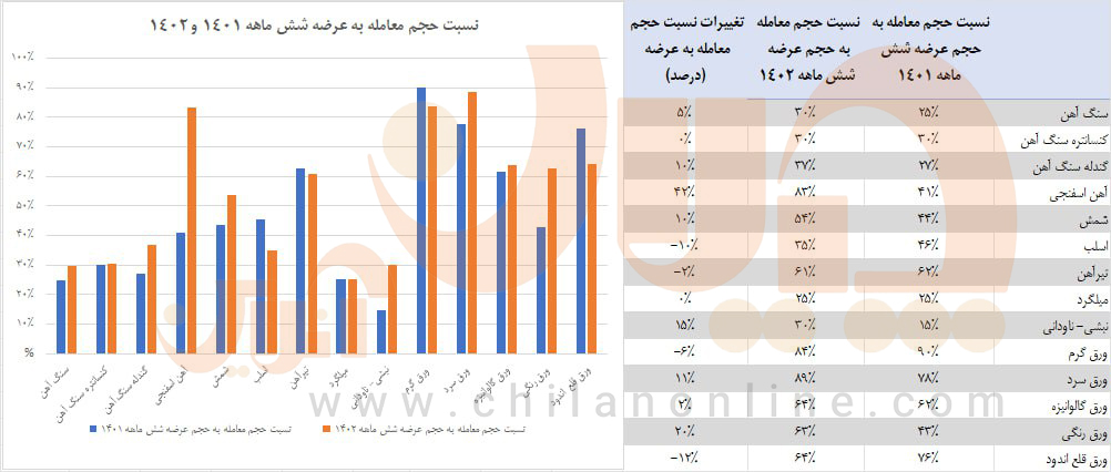 مقایسه تطبیقی چیلان از شاخص نسبت حجم معامله به حجم عرضه محصولات زنجیره فولاد در بورس کالا طی نیمه اول امسال و سال گذشته، حاکی از چند نکته مهم است: