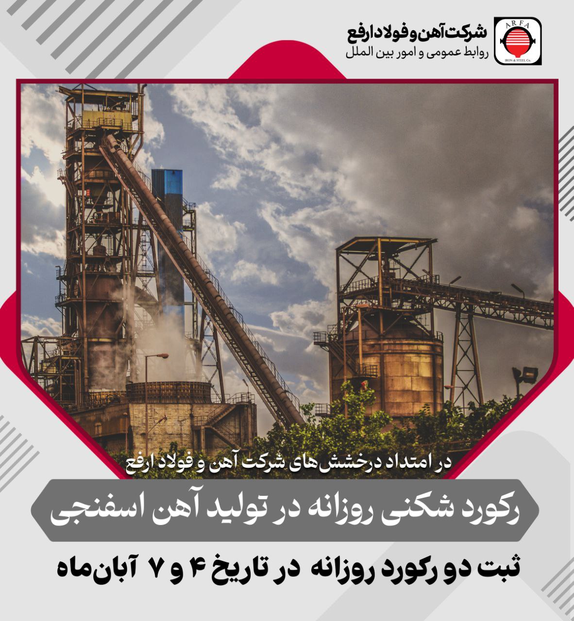 شرکت آهن و فولاد ارفع در چهارم و هفتم آبانماه رکورد تولید آهن اسفنجی را شکست و با تولید "۳۶۴۱ تن" در ۴ آبان ۱۴۰۲ از رکورد روزانه ۱۷ شهریور ۱۴۰۲ به میزان ۳۶۴۱ تُن خود عبور کرد.