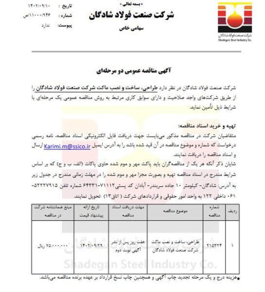 - آگهی فراخوان ارزیابی کیفی مناقصه عمومی دو مرحلهای فولاد شادگان با موضوع ” مهندسی، تهیه و تأمین، ساخت و نصب، تست و راه اندازی مسیر شارژ ترکیبی گندله واحد احیاء مستقیم به روش EPC “