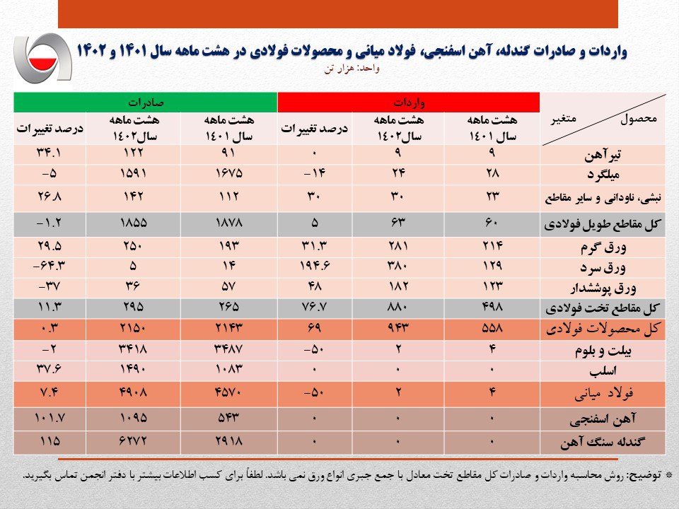 کل صادرات محصولات فولادی کشور در هشت ماهه سال ۱۴۰۲، ۱ میلیون ۸۵۳ هزار تن بوده که نسبت به مدت مشابه سال قبل، افزایش ۴ درصدی را نشان میدهد، همچنین واردات کل محصولات در ۷ ماهه نخست سال ۷۹۷ هزار تن بوده است که اقزایش ۶۴.۳ درصدی را نسبت به مدت مشابه سال قبل نشان می دهد.