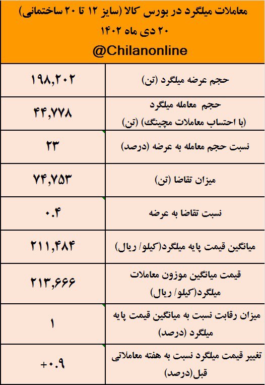 به گزارش چیلان ،امروز چهارشنبه ۲۰ دی ماه ۱۴۰۲، ۱۹۸ هزارتن میلگرد پرمصرف ساختمانی (سایز ۱۲ تا ۲۰) در بورس کالا عرضه شد که با احتساب معاملات مچینگ، ۴۴ هزارتن معادل ۲۳ درصد از این عرضهها مورد معامله قرار گرفت.