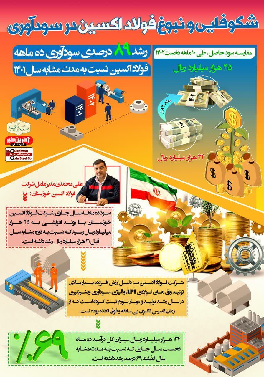 مدیرعامل شرکت فولاد اکسین خوزستان با اشاره به اینکه سود شرکت در ده ماه امسال ۸۹ درصد نسبت به مدت مشابه سال قبل رشد کرده است، گفت: سود کل سال ۱۴۰۱ حدود ۳۴ هزار میلیارد بوده و سود ۱۰ ماه ابتدایی امسال ۱۱ هزار میلیارد ریال بیشتر از کل سود سال گذشته می باشد.