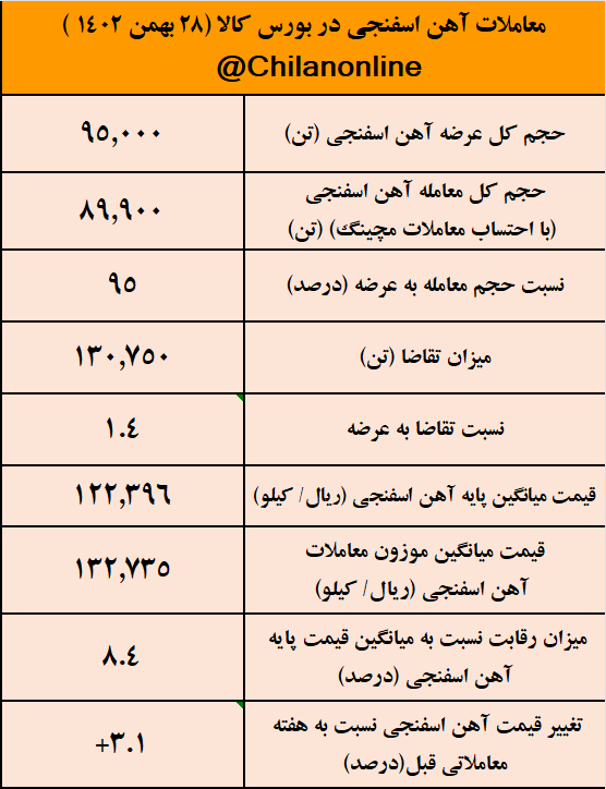 به گزارش چیلان ، امروز شنبه ۲۸ بهمن ۱۴۰۲، بورس کالا میزبان عرضه ۹۵ هزار تن آهن اسفنجی بود که با توجه به ثبت تقاضای ۱.۴ برابری نسبت به عرضه، ۹۵ درصد عرضهها مورد معامله قرار گرفت.