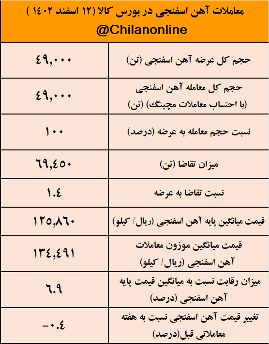به گزارش چیلان ، امروز شنبه ۱۲ اسفند ۱۴۰۲، بورس کالا میزبان عرضه ۴۹ هزار تن آهن اسفنجی بود که با توجه به ثبت تقاضای ۱.۴ برابری نسبت به عرضه، ۱۰۰ درصد عرضهها مورد معامله قرار گرفت.