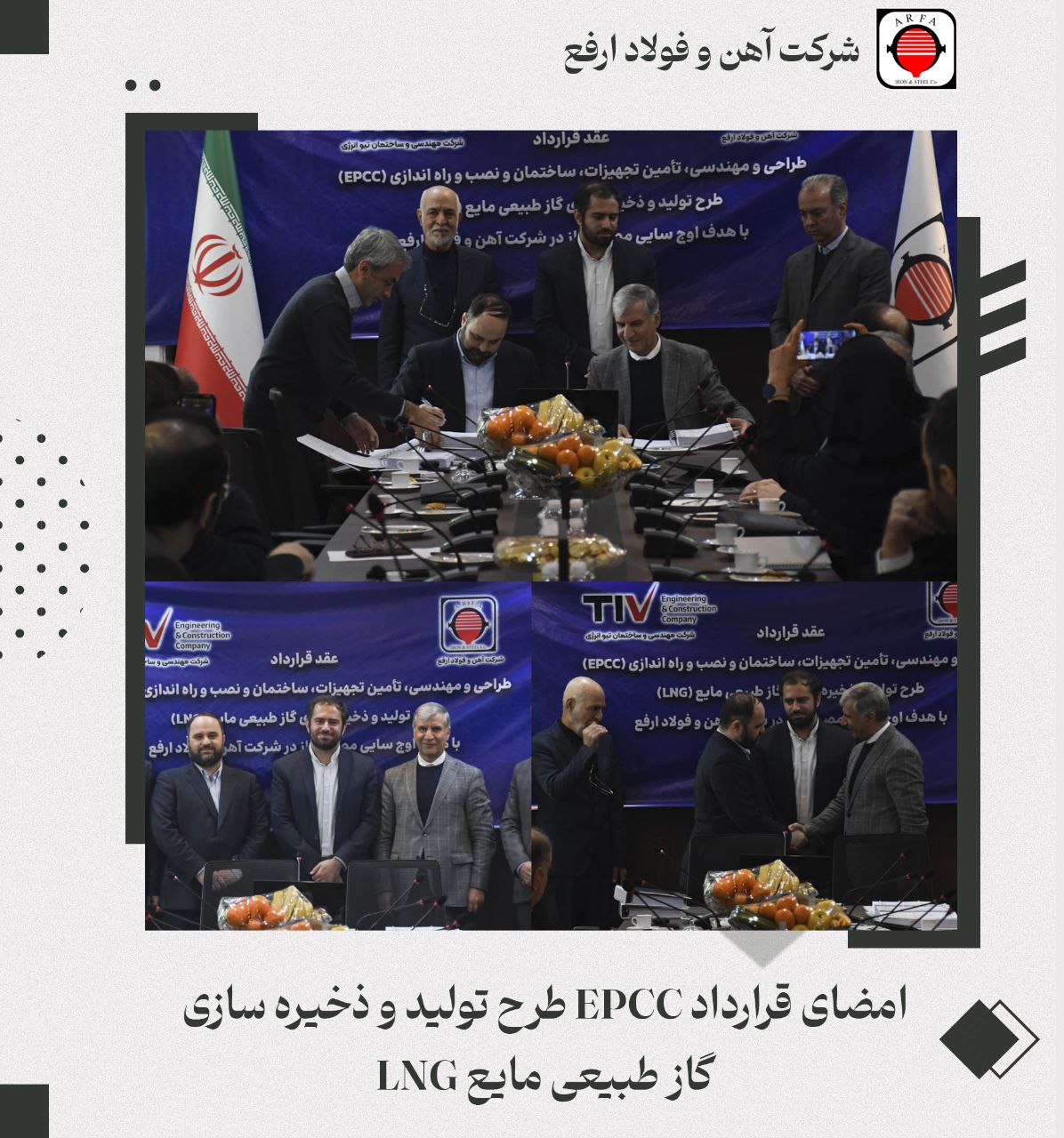 شرکت آهن و فولاد ارفع قرارداد طراحی و مهندسی، تامین تجهیزات، ساختمان و نصب و راه اندازی (EPCC) طرح تولید و ذخیره سازی گاز طبیعی مایع (LNG) به امضا رساند.