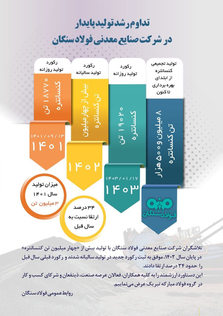 فولاد سنگان و مجموعه کارکنان این شرکت صنعتی- معدنی در شمال شرق کشور، تمامی عزم خود را برای کسب دستاوردها و تحقق اهداف برنامهریزی شده در جهت تولید پایدار به کار گرفتهاند که نمونه آن ثبت رکورد تولید روزانه کنسانتره در ابتدای سال ۱۴۰۳ می باشد.