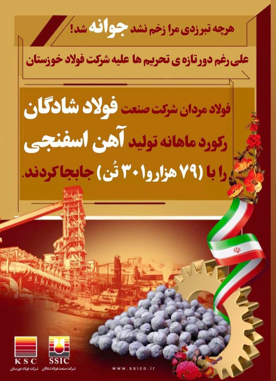 علیرغم دور تازهی تحریم ها علیه شرکت فولاد خوزستان، به همت کارکنان شرکت صنعت فولاد شادگان، رکورد ماهانه تولید آهن اسفنجی در فروردین ماه ۱۴۰۳ به میزان ۷۹ هزار و ۳۰۱ تُن شکسته شد.